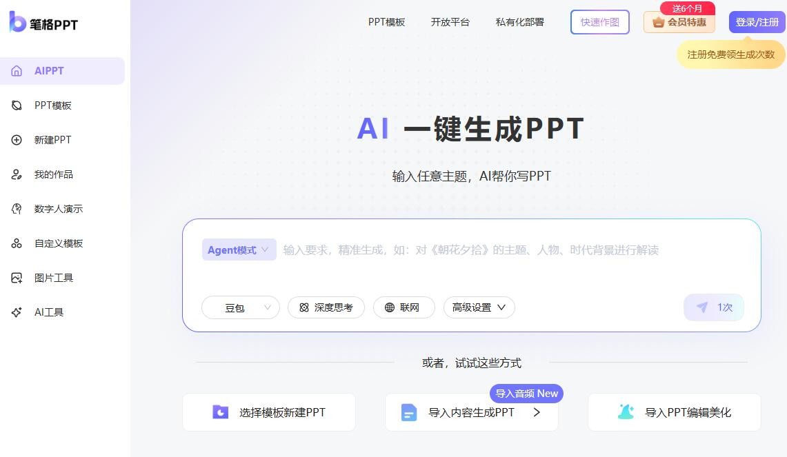 比格PPT是一款基于AI的在线PPT制作工具。输入任意的主题,他就能在短时间内帮助您生成PPT,并且支持各种格式文档导入,并智能识别生成大纲。还支持不同场景模板的更换。